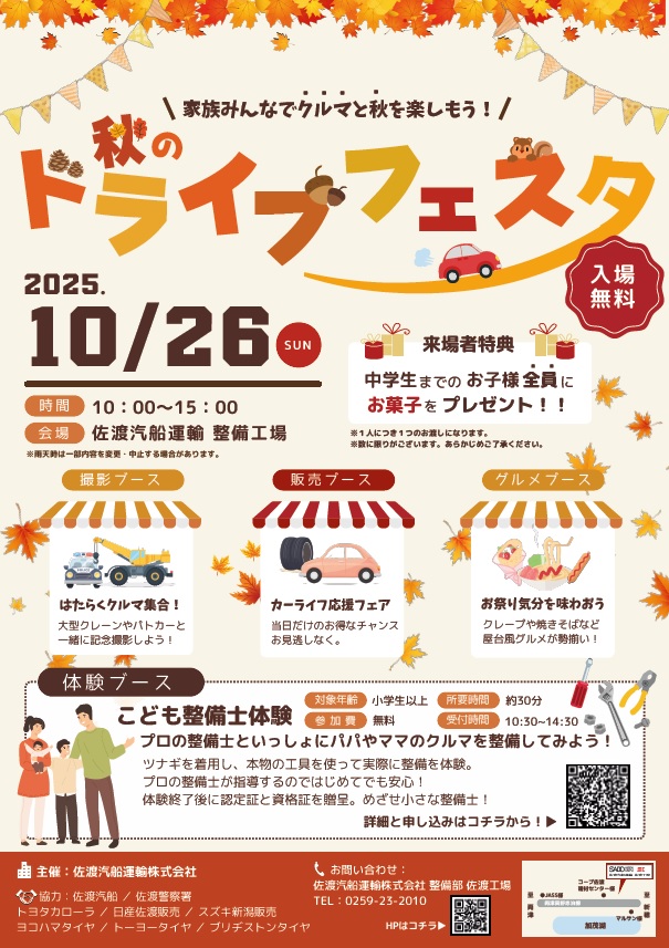 整備部 佐渡工場では、お客様への日頃の感謝をこめて「秋のドライブフェスタ」を開催いたします。