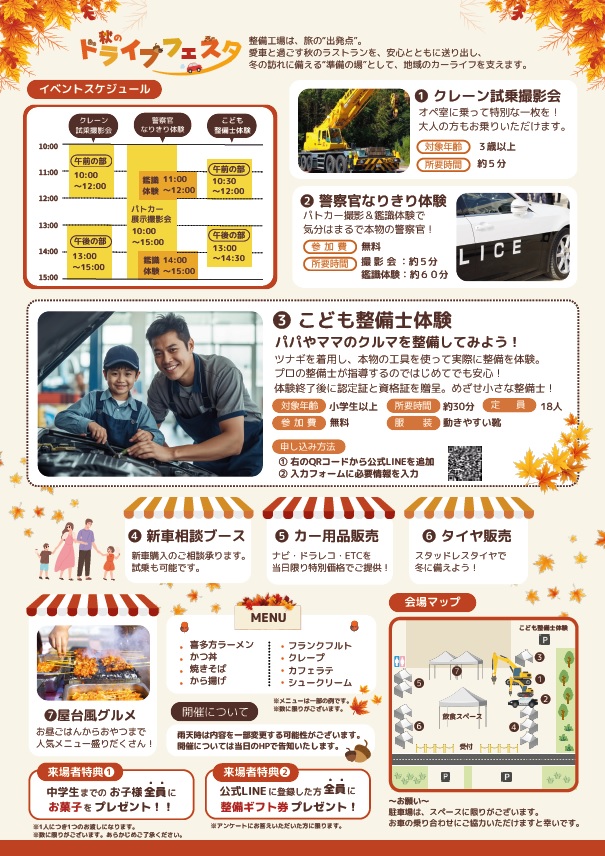 ⦅秋の終わりに、愛車ともうひと旅。冬の安心、その一歩を⦆お子様も楽しめるイベントをご用意しておりますので、皆様お誘いあわせのうえ、ぜひご来場ください。