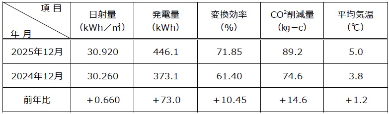 太陽光発電システムの運転データ(12月分)を更新いたしました。