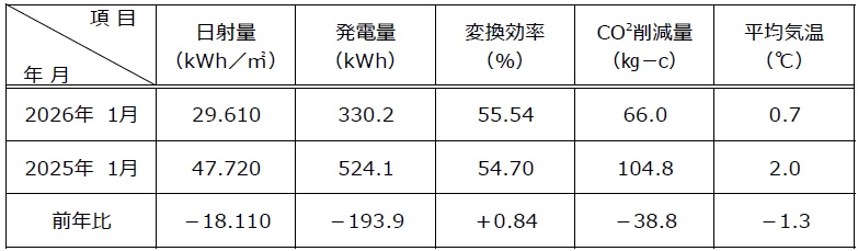 太陽光発電システムの運転データ(1月分)を更新いたしました。